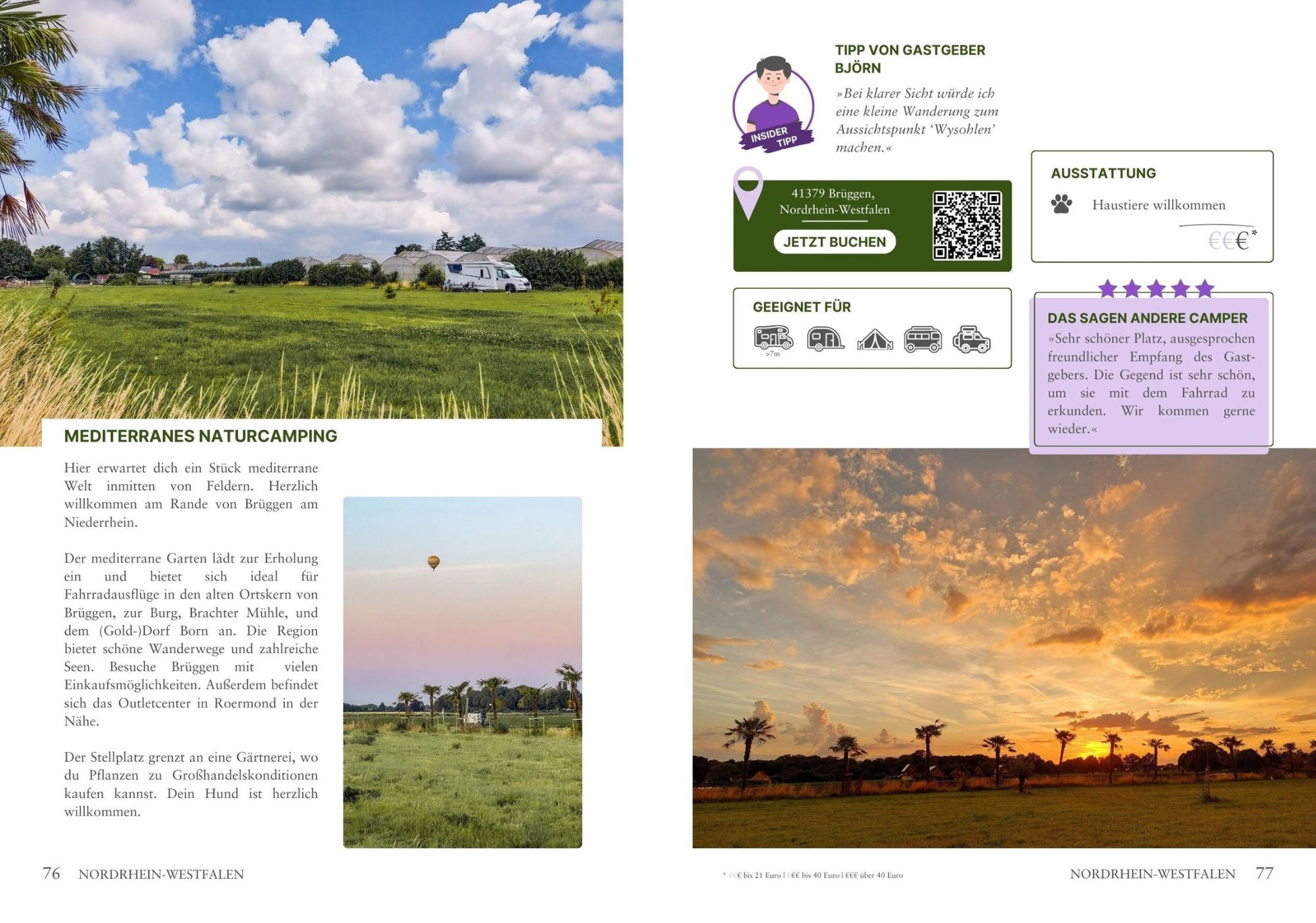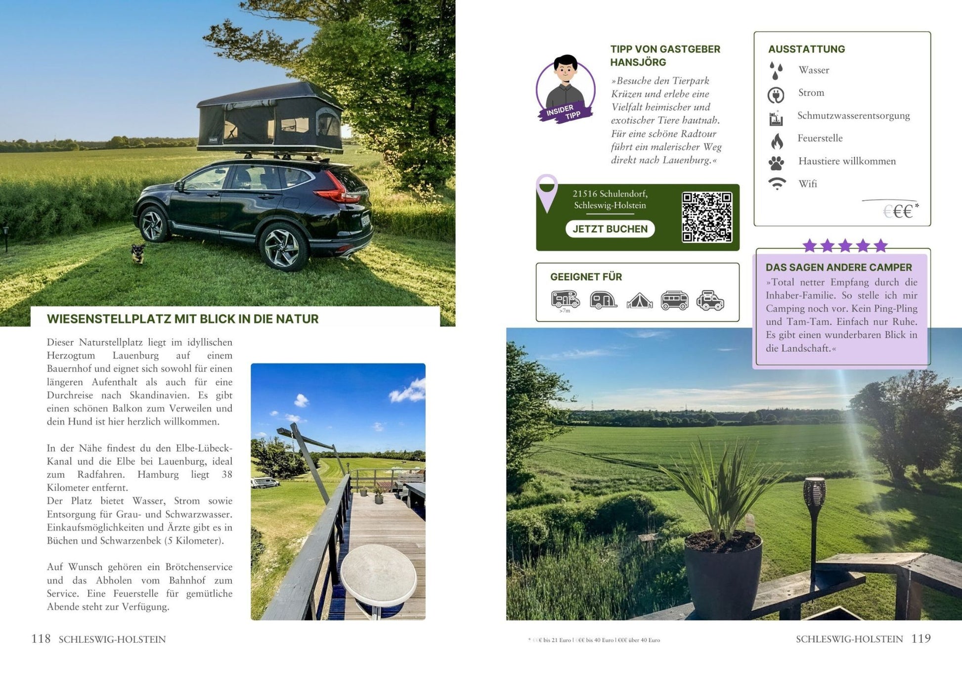 Der erste Eindruck: Ja, der zählt! Deswegen ist dieser Reiseführer mit vielen Stellplatzbildern, ausführlichen Beschreibungen, Ortsangaben, Ausstattungsmerkmalen und Bewertungen anderer Campinggäste versehen. Jeder Platz ist für Wohnmobile geeignet. An Fahrzeugsymbolen, kannst du ablesen, ob der Platz ebenfalls für Wohnwagen, Dachzelte oder Zelte geeignet ist. So kannst du unbesorgt dein neues Ziel ansteuern. Camping mit Hund ist hier nicht nur erlaubt, sondern sogar gerne gesehen.