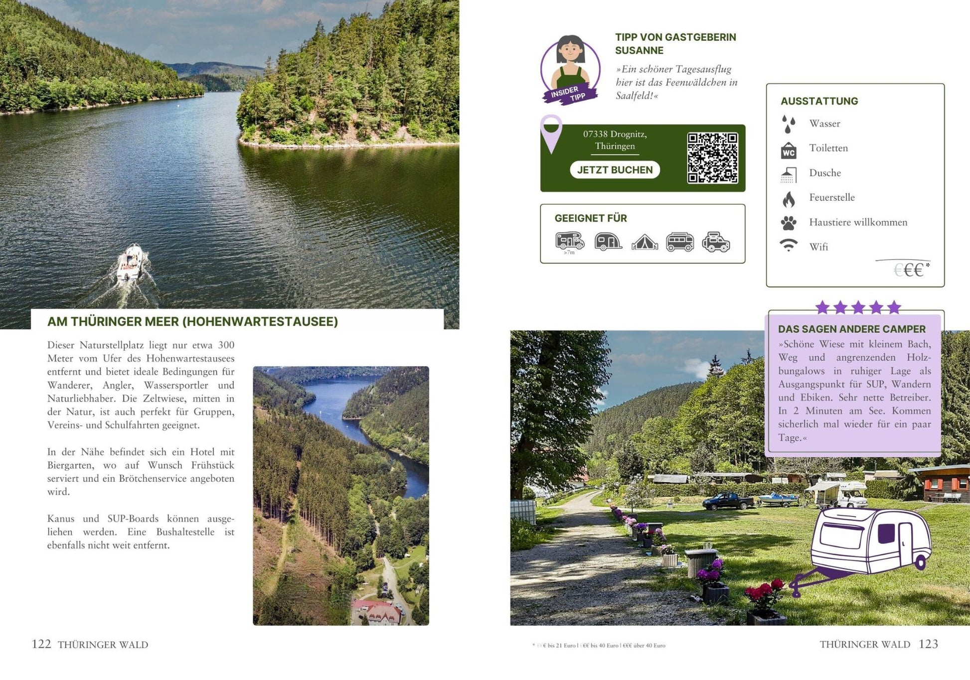 Der erste Eindruck: Ja, der zählt! Deswegen ist dieser Reiseführer mit vielen Stellplatzbildern, ausführlichen Beschreibungen, Ortsangaben, Ausstattungsmerkmalen und Bewertungen anderer Campinggäste versehen. Jeder Platz ist für Wohnmobile geeignet. An Fahrzeugsymbolen, kannst du ablesen, ob der Platz ebenfalls für Wohnwagen, Dachzelte oder Zelte geeignet ist. So kannst du unbesorgt dein neues Ziel ansteuern.
